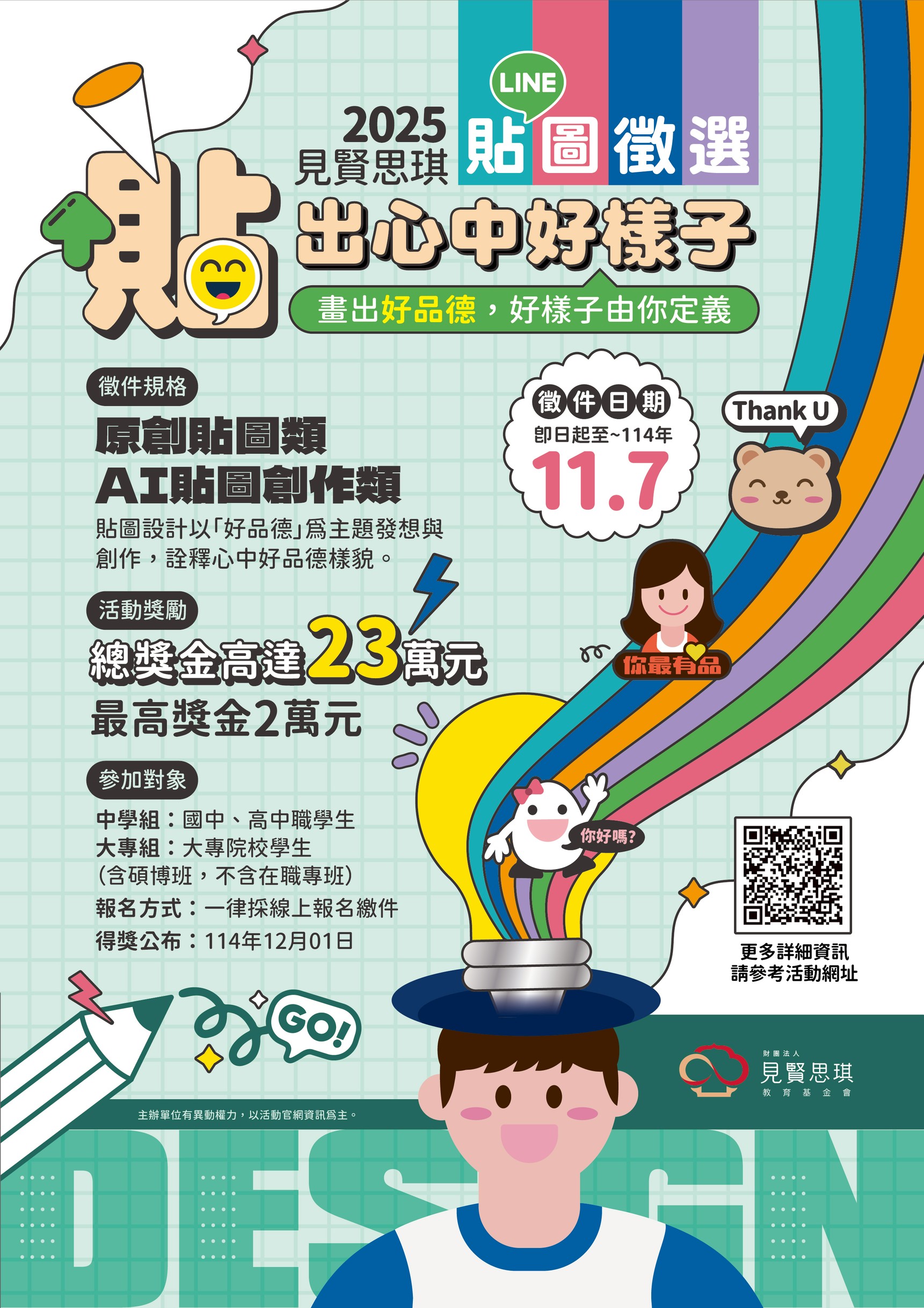 | 主旨: | 檢送本會辦理114年度「貼出心中好樣子」貼圖徵選活動簡章,敬請鼓勵學生踴躍參與,並協助公告活動訊息,請查照。 |