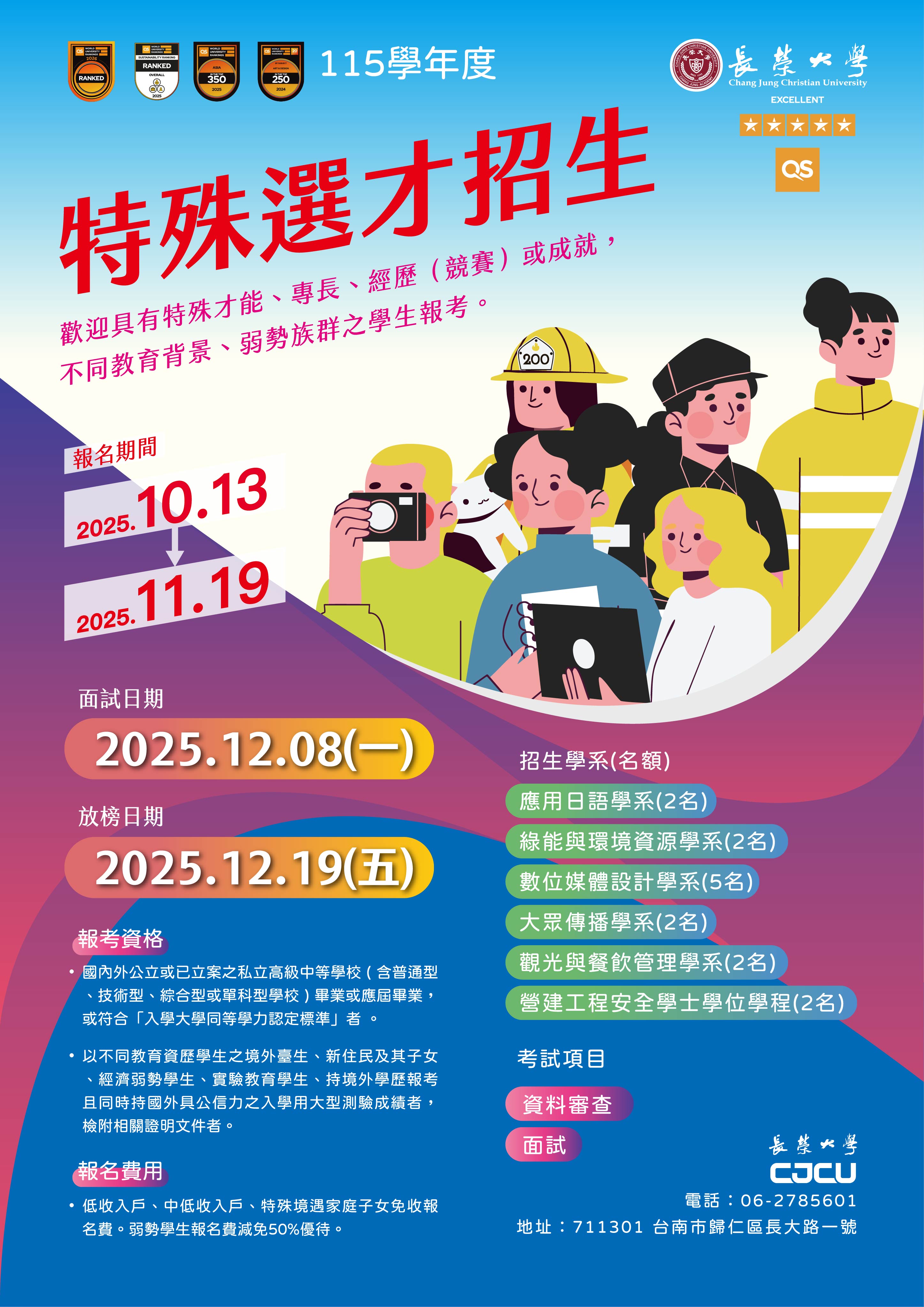 本校為鼓勵具特殊才能、專長、經歷(競賽)或成就,不同教育背景及弱勢族群之學生進入大學就讀,特辦理115學年度特殊選才招生。