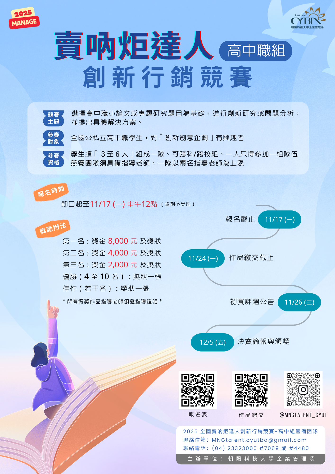 公告朝陽科技大學企業管理系主辦之「2025全國賣吶炬達人創新行銷競賽-高中職組」比賽辦法,請有意者詳參附件資料。