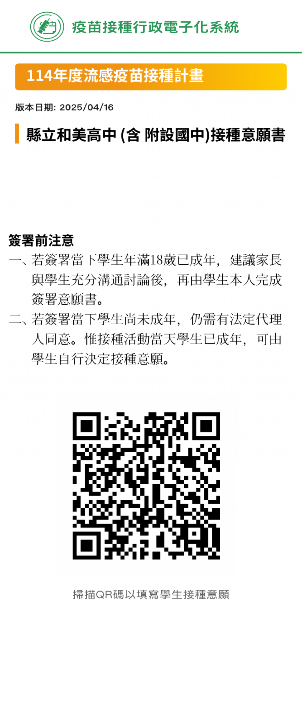 1.施打日期:114年10月31日在活動中心,上午國中部,下午高中部。