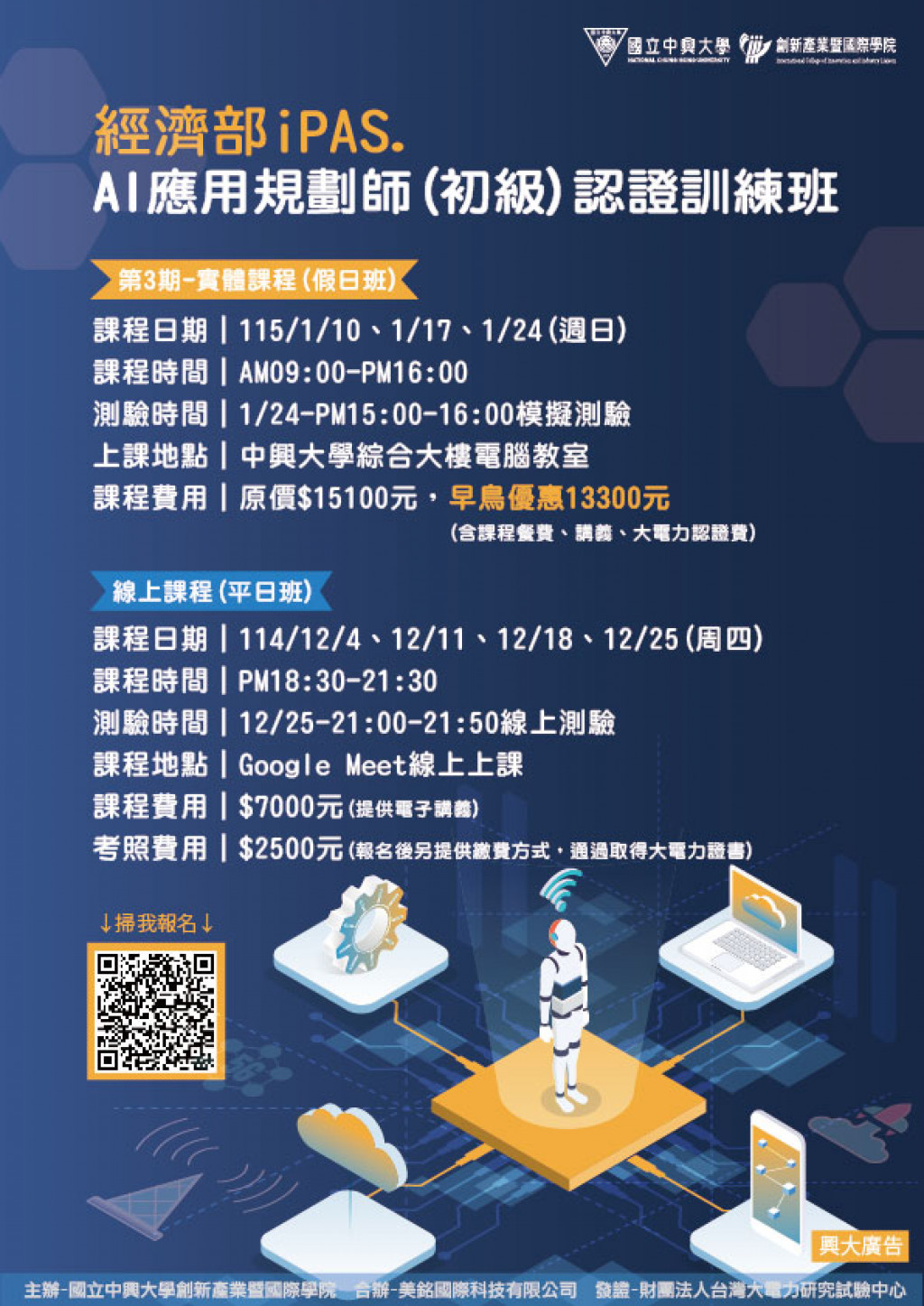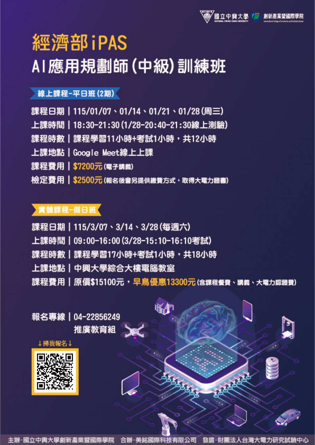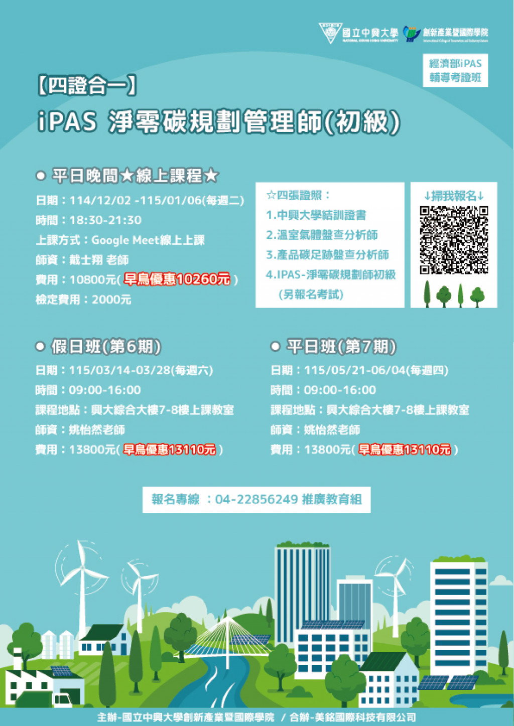 | 二、 | 招生對象:適合對「淨零碳排」與「AI應用規劃」有興趣者;適合公司內訓及有意成為「淨零碳排」與「AI 應用規劃」領域專業顧問或專業服務人員。 |