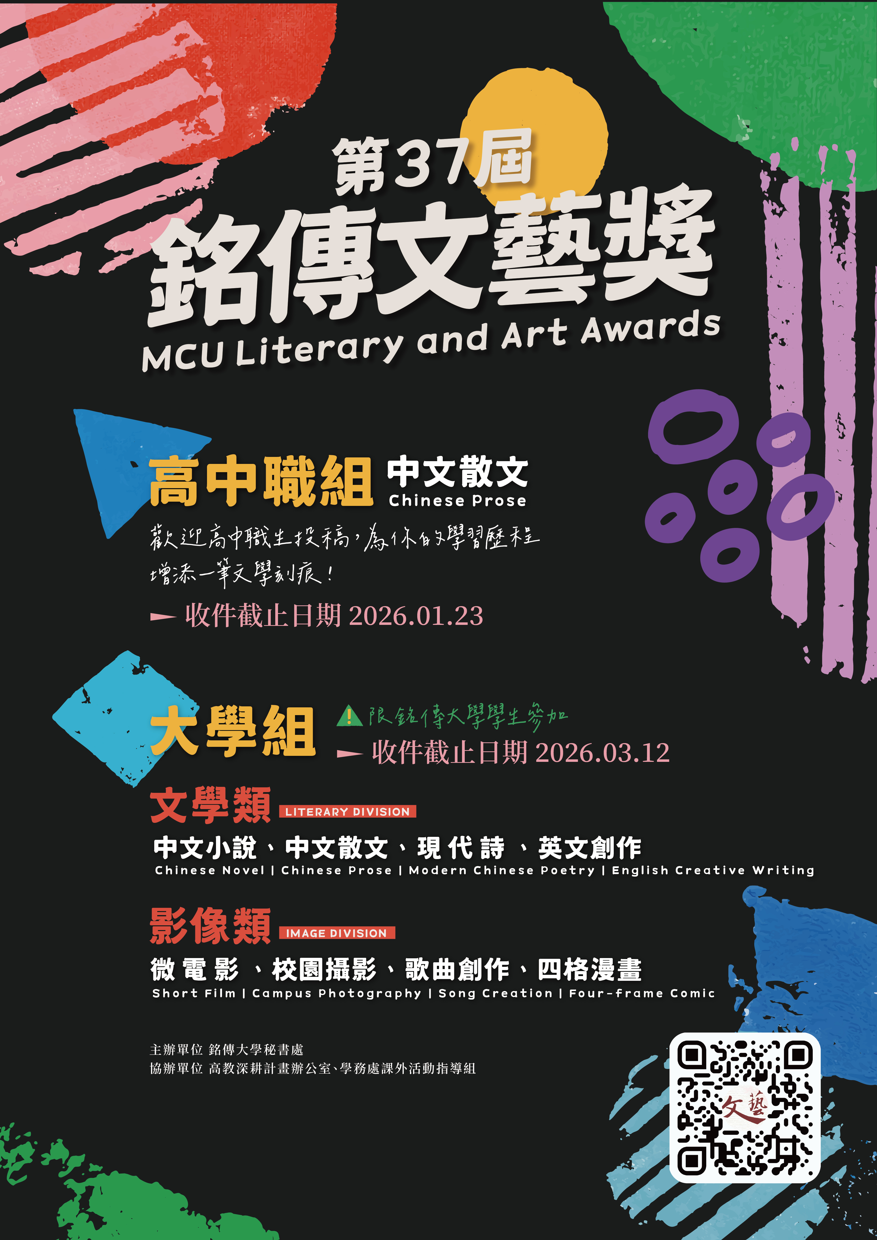 公告銘傳大學第37屆文藝獎高中職散文組徵文辦法及海報電子檔,請有志寫作之本校高中部同學踴躍參賽。
