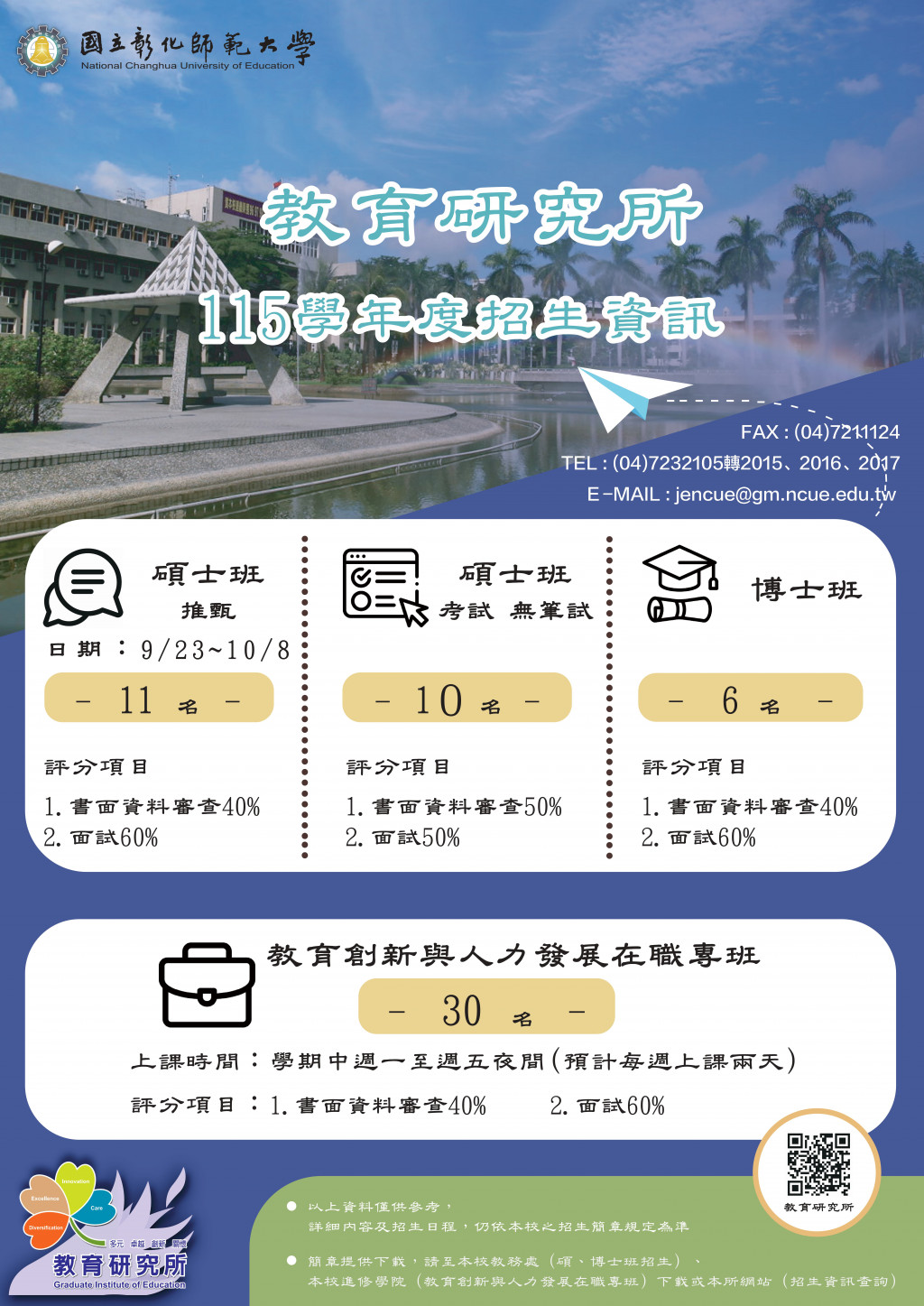 國立彰化師範大學教育研究所115學年度碩士在職專班招生簡章入學資訊,請查照。