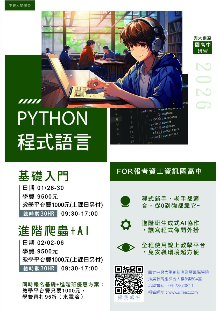 國立中興大學2026年寒假Python程式設計系列、ACP與SSE色彩學國際證照輔導、AI應用故事 X 探索島系列招生,即日起開放報名。