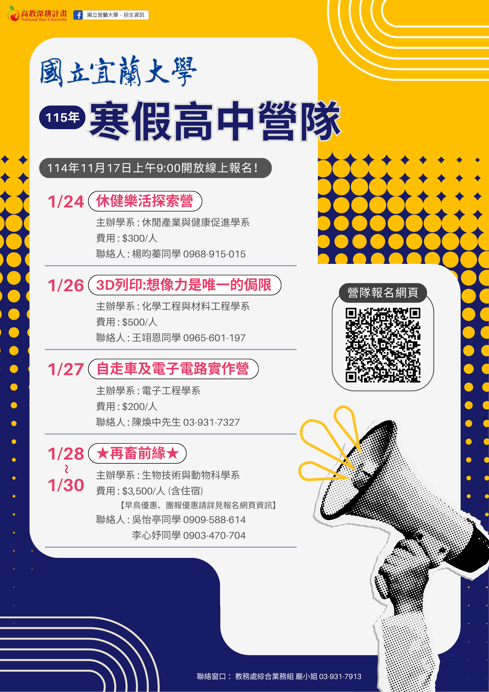一、檢附活動海報乙份,完整訊息請至活動網站(網址:https://sites.google.com/ems.niu.edu.tw/115winter),或由國立宜蘭大學首頁(網址:https://www.niu.edu.tw)/招生資訊/在宜大夢想起飛/高中營隊查詢。