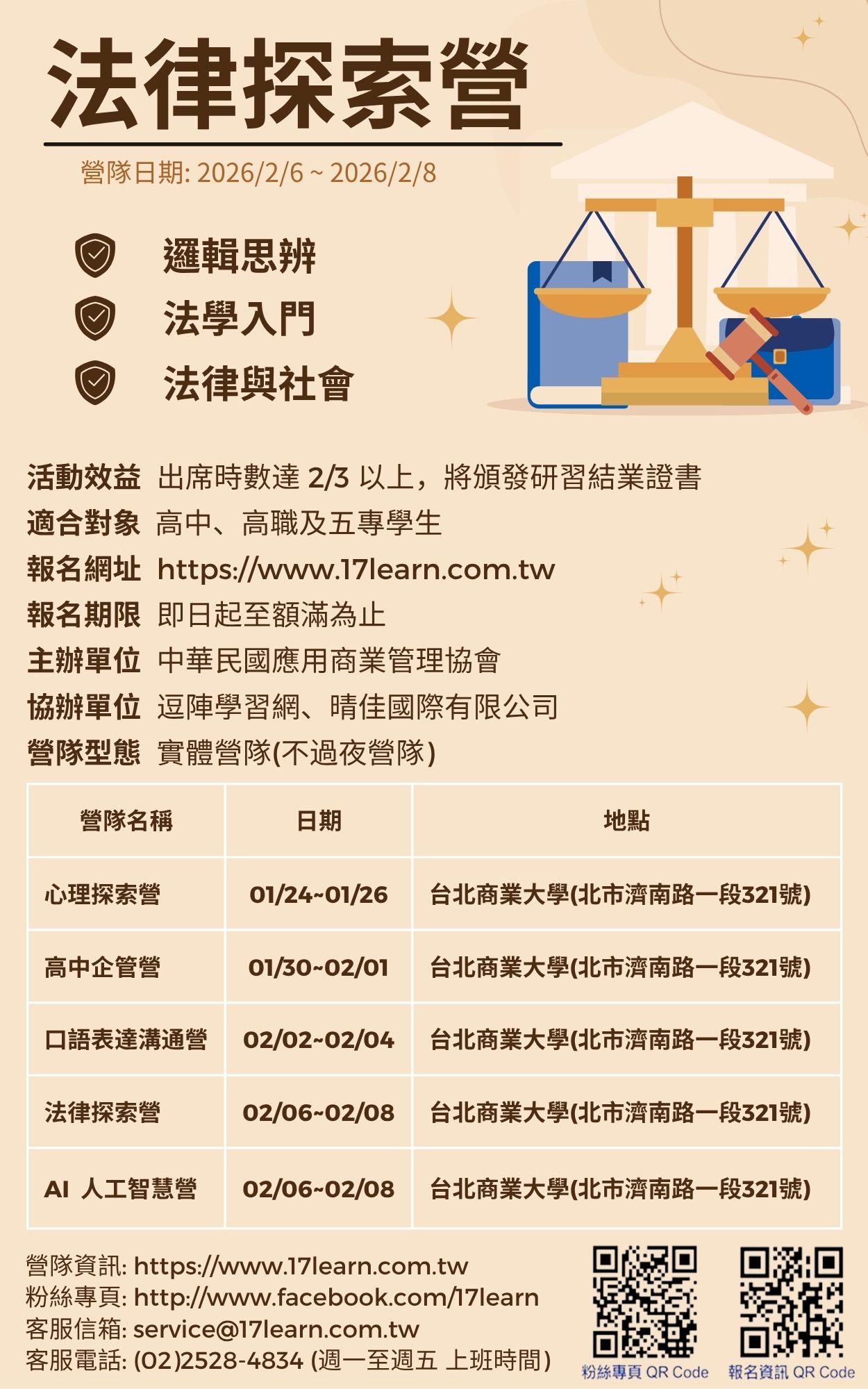社團法人中華民國應用商業管理協會法律探索營-2026冬令營報名開始!!檢附活動簡章海報,歡迎有志於往【法政學群】、或相關科系探索體驗的同學踴躍報名參加。