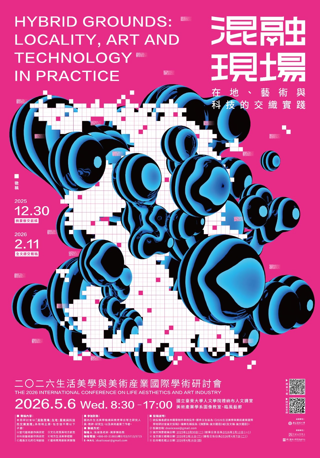 公告國立臺東大學美術產業學系舉辦「2026生活美學與美術產業國際學術研討會」論文徵稿辦法中文簡章及海報1份,供有意參與者參考。