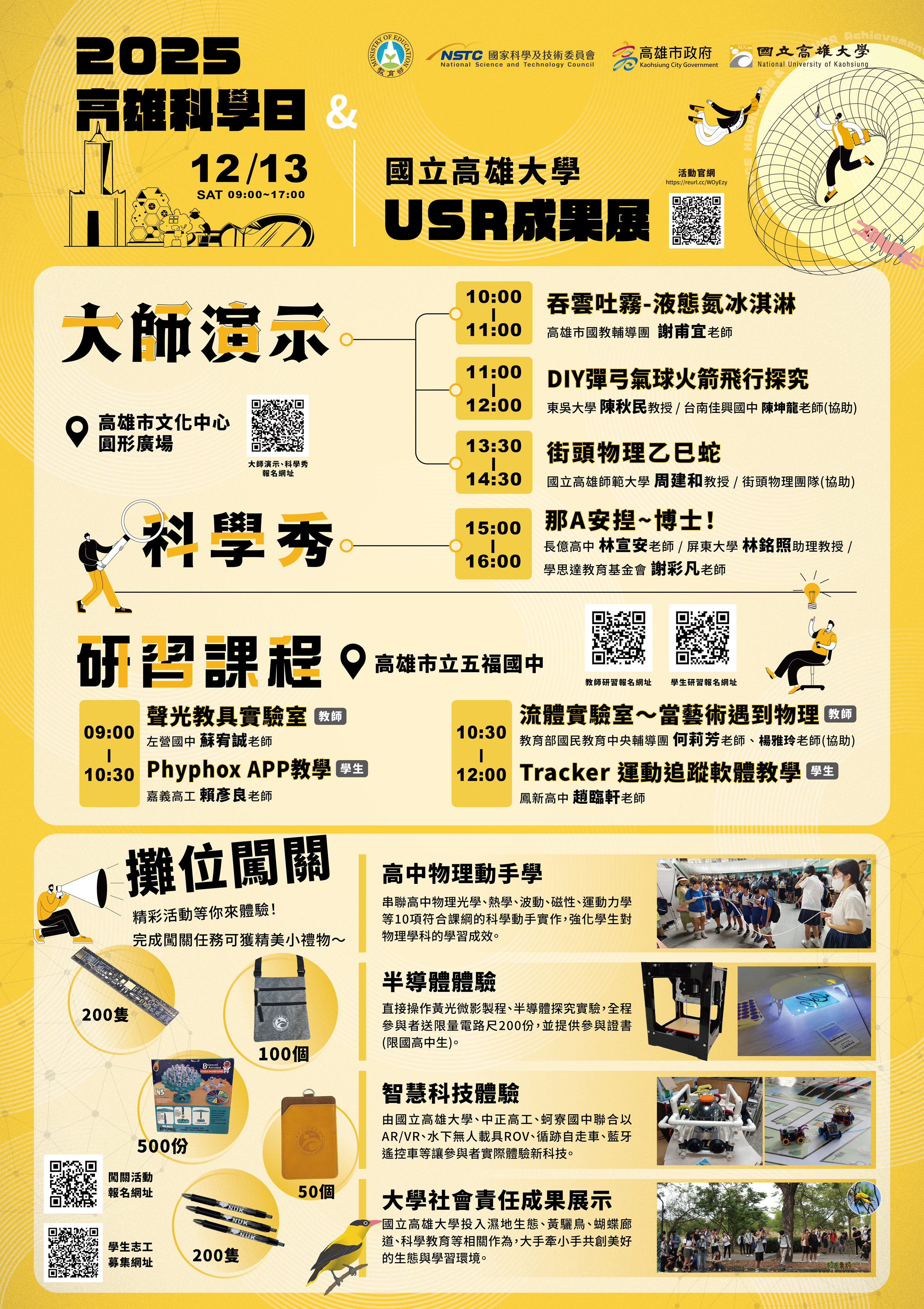 | 一、 | 為推廣科學教育與分享本校師生執行USR計畫豐碩成果,辦理旨揭成果展,透過大師演示、科學秀、大眾科普、半導體製程體驗、智慧科技體驗,及教師與學生研習,以擴大各界交流。 |