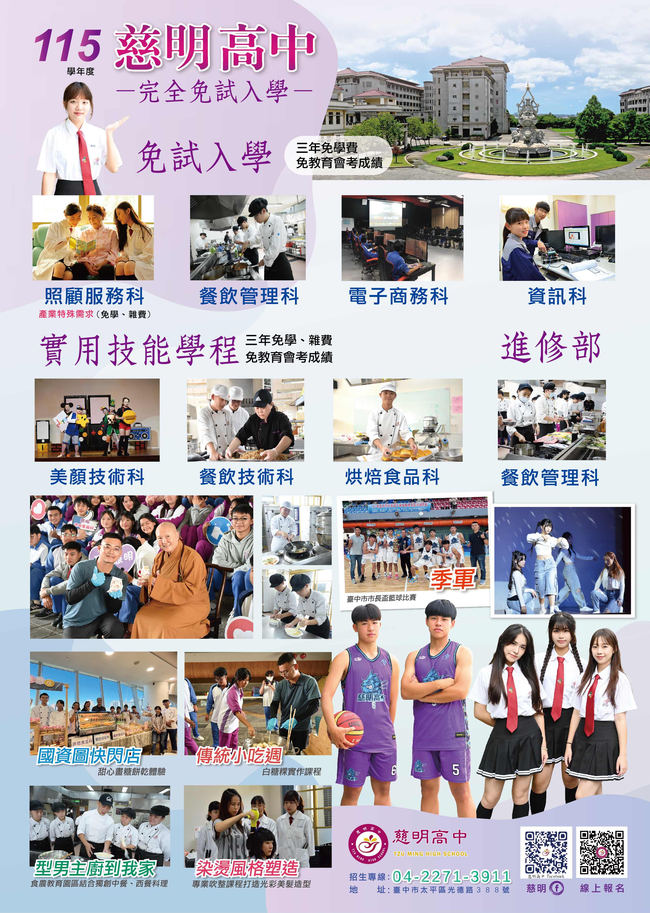 二、115學年度開設「餐飲管理科」、「觀光事業科」、「美容科」輪調式建教合作班;另「餐飲管理科」開設第3年王品專班。