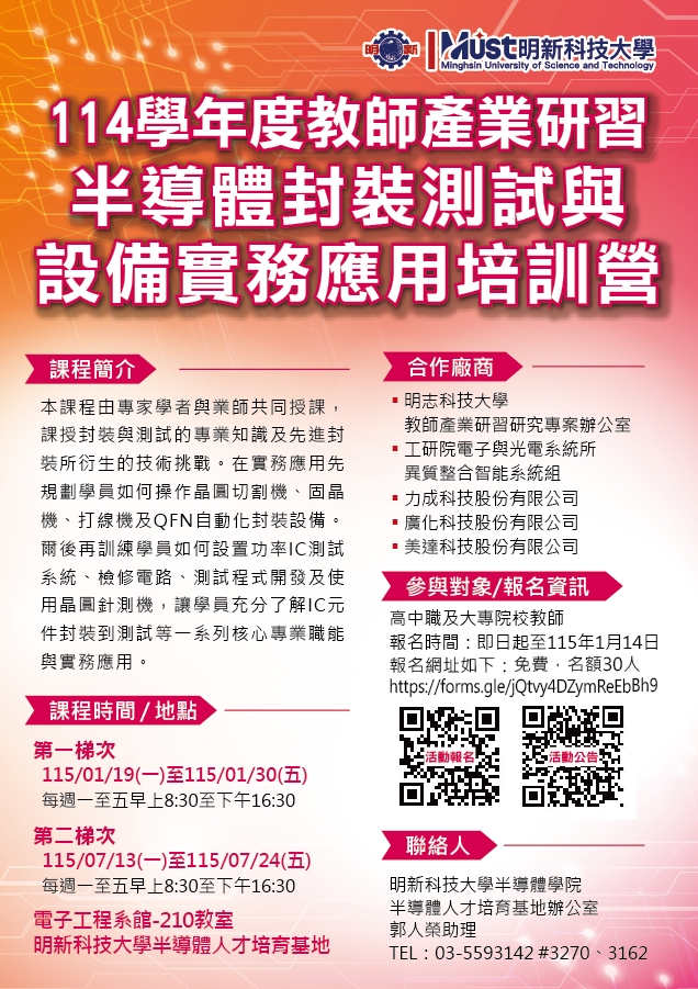 明新學校財團法人明新科技大學辦理114學年度教師產業研習「半導體封裝測試與設備實務應用」培訓課程