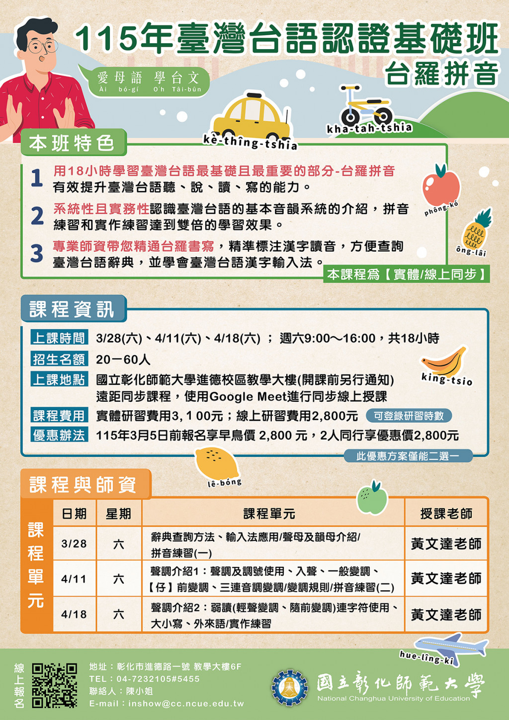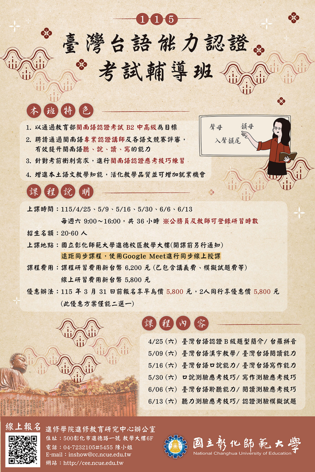 檢送國立彰化師範大學進修學院推廣教育課程「115年臺灣台語認證基礎班-台羅拼音」、「115年臺灣台語能力認證考試輔導班」課程簡章,請查照。
