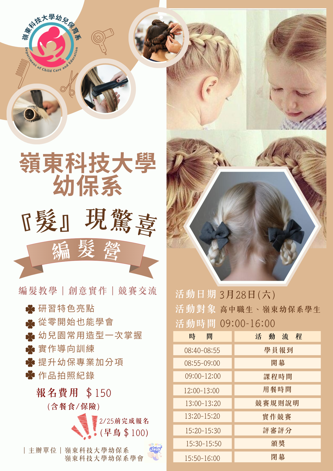 嶺東科技大學幼兒保育系辦理「髮現驚喜編髮營」活動,歡迎同學踴躍報名參加