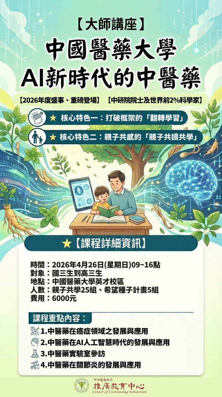 | 一、 | 講座時間:2026年04月26日(日),09點到16點,詳細資訊請至連結(https://cce.cmu.edu.tw/news/462)查詢。 |