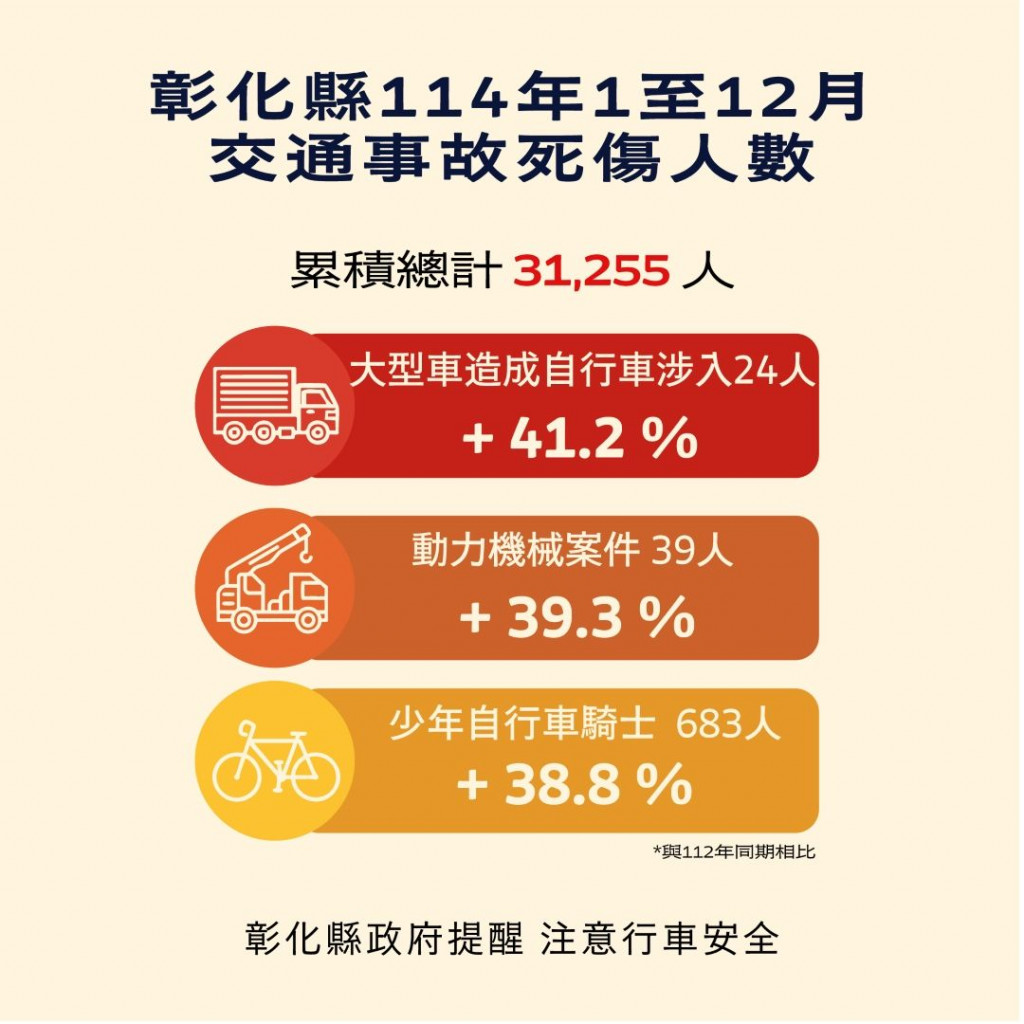 本縣114年1-12月道路交通事故死傷累計31,255人,請貴單位及所屬機關運用既有宣傳通路協助加強宣導,共同降低死傷人數