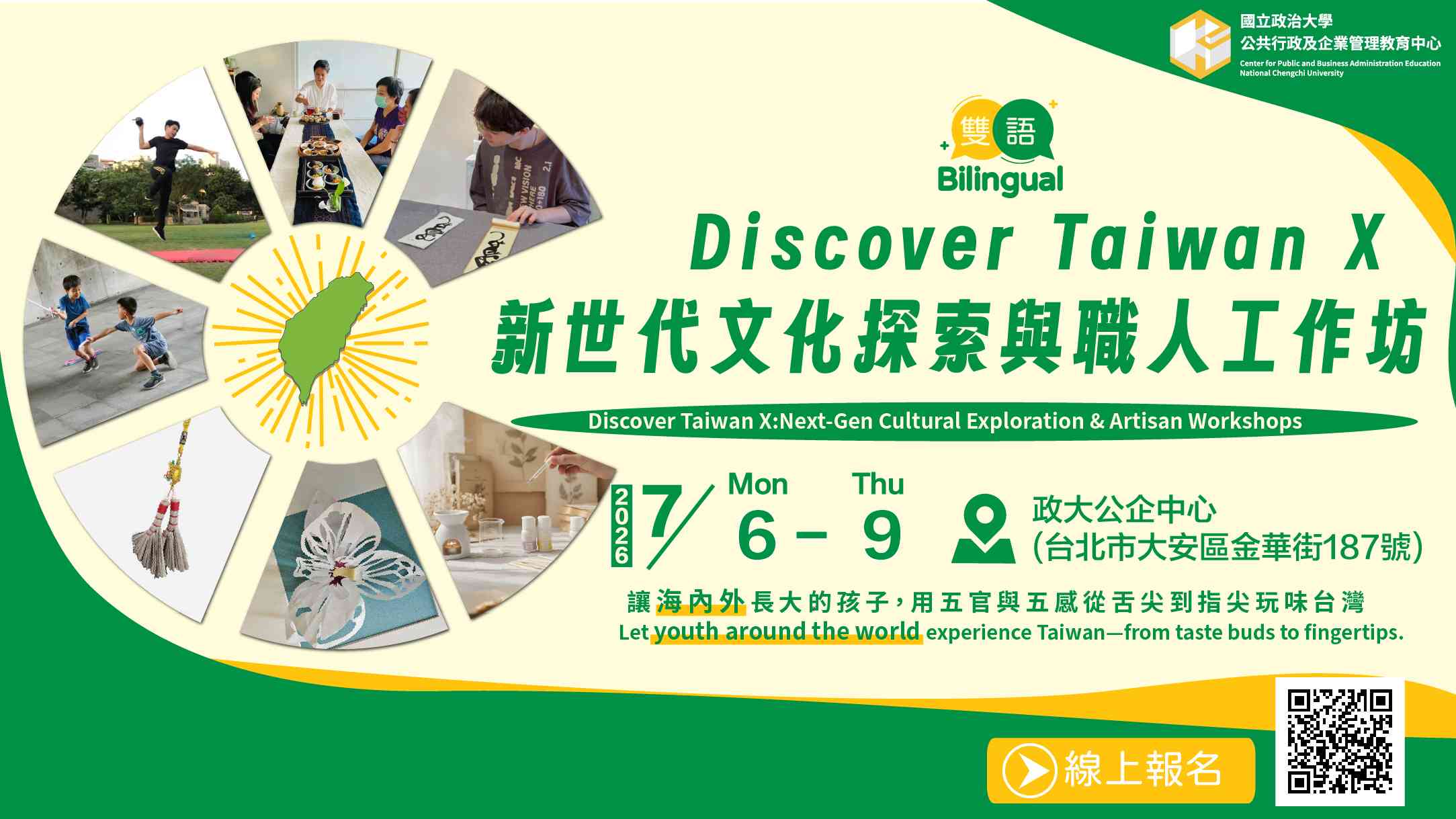 三、營隊資訊:「Discover Taiwan X 新世代文化探索與職人工作坊」擬訂於民國115年7月6日至7月9日辦理。網址:https://cpbae.nccu.edu.tw/cpbae/class?id=all&classId=N8D2B5071。