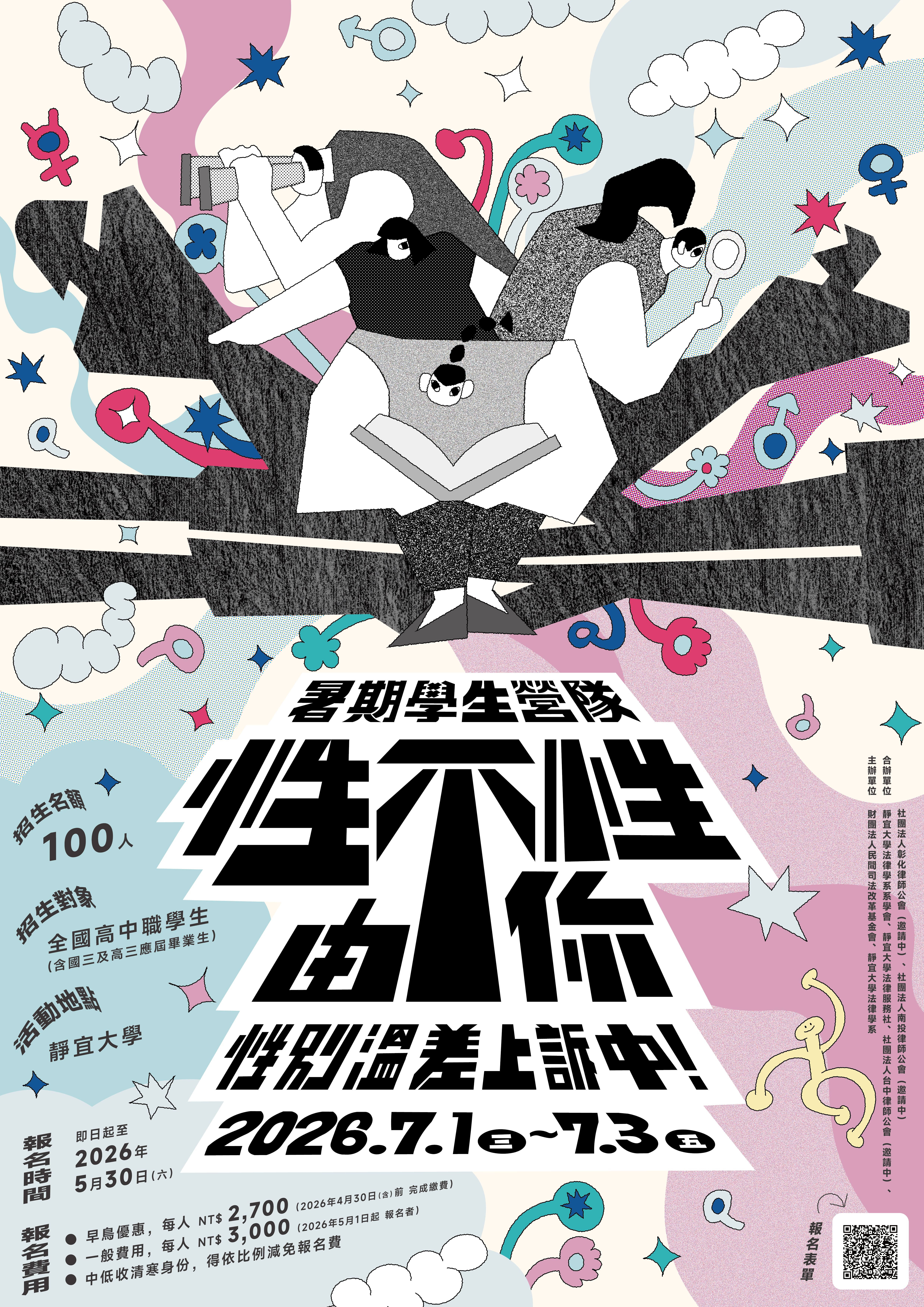 靜宜大學法律學系與財團法人民間司法改革基金會共同辦理暑期學生營隊【性不性由你—性別溫差上訴中!】開放報名中,歡迎同學踴躍報名參加。
